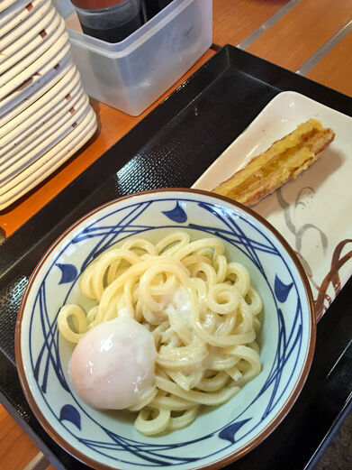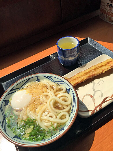 うどんと温泉卵とちくわ揚げ。
