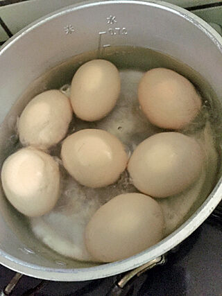 まだ、オープンしてないし、いろいろと時間がかかる日になりそうなんで、とりあえずの食事用としてゆで卵を作る。